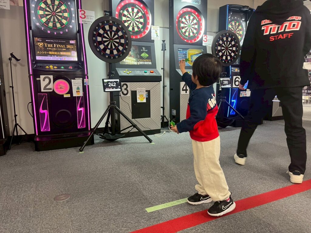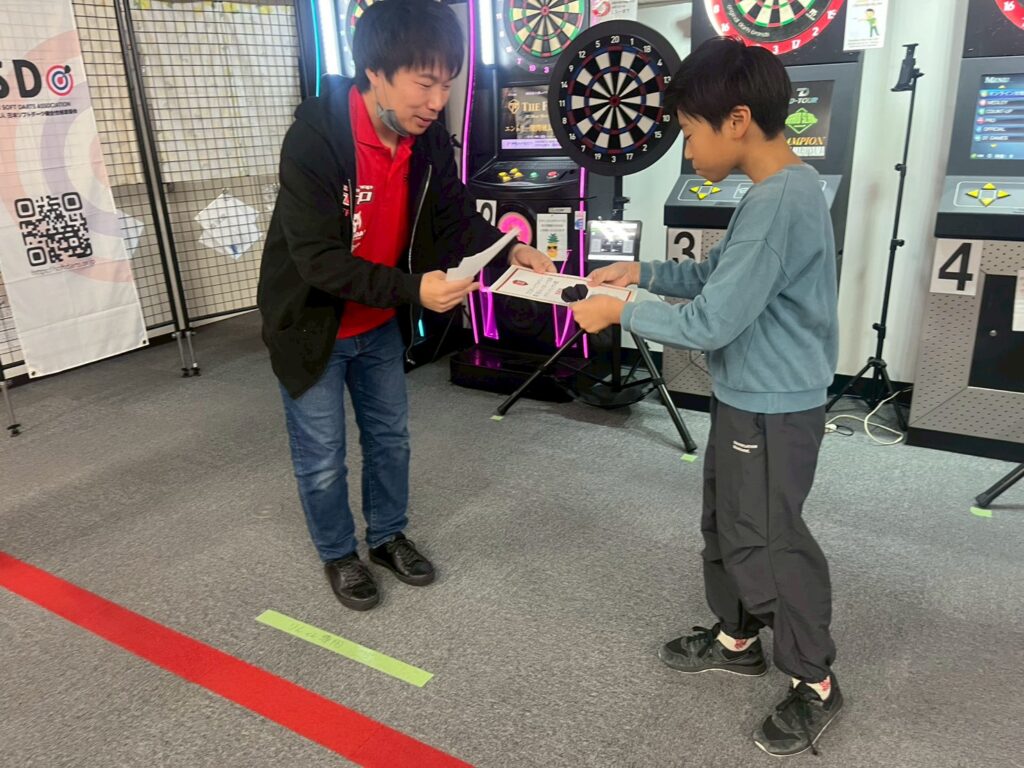 第1部はカウントアップの部。参加してくれたお子様の年齢差も考慮して、U14の部とU11の部で分けて表彰しました。U11の部はダーツマシンの形状はそのままに、高さを133cmに設定した小さめのマシンを準備しているので、未就学のお子様でも身長を気にすることなく、参加してくれました。”競う”ということが初めてでみんな真剣に取り組んでくれました。